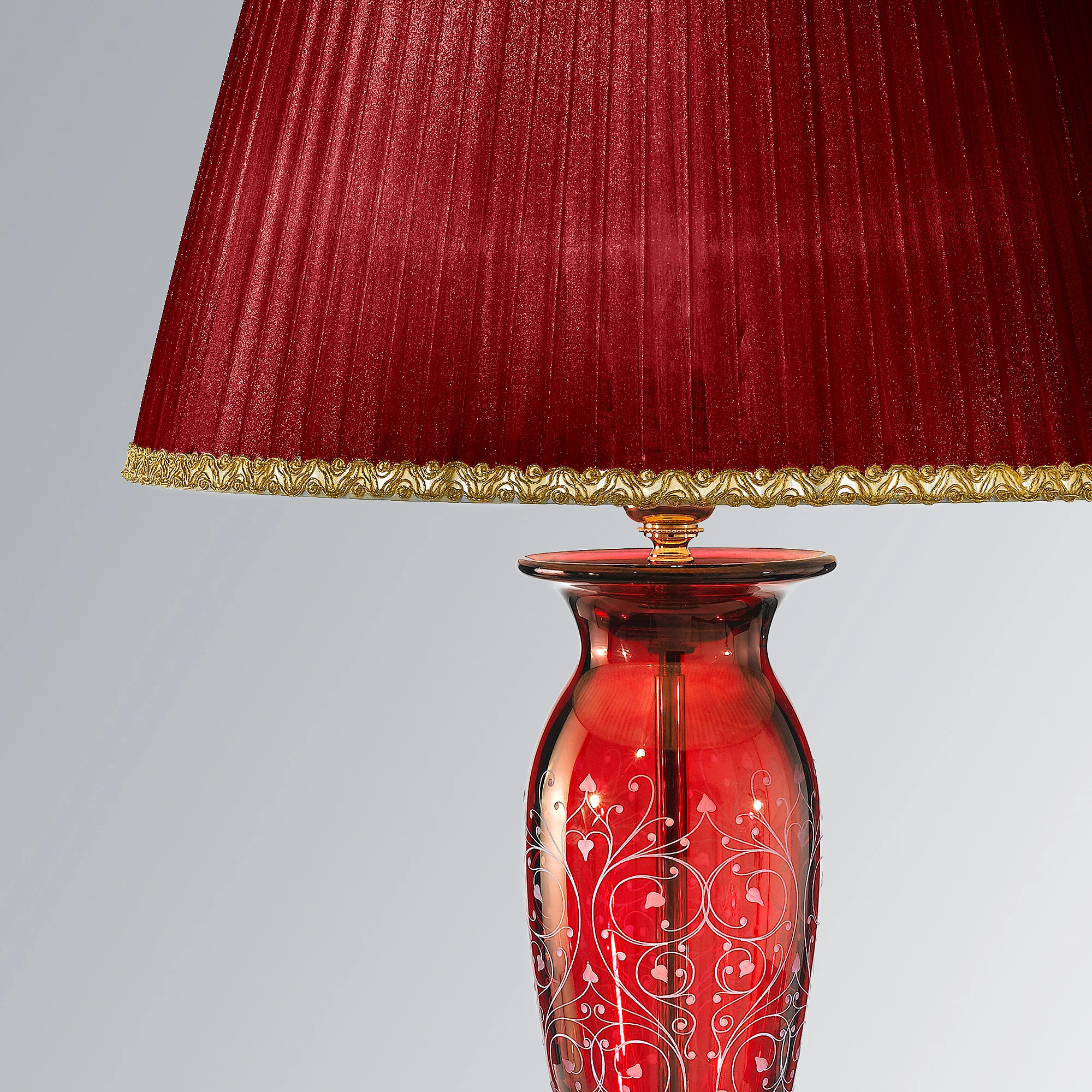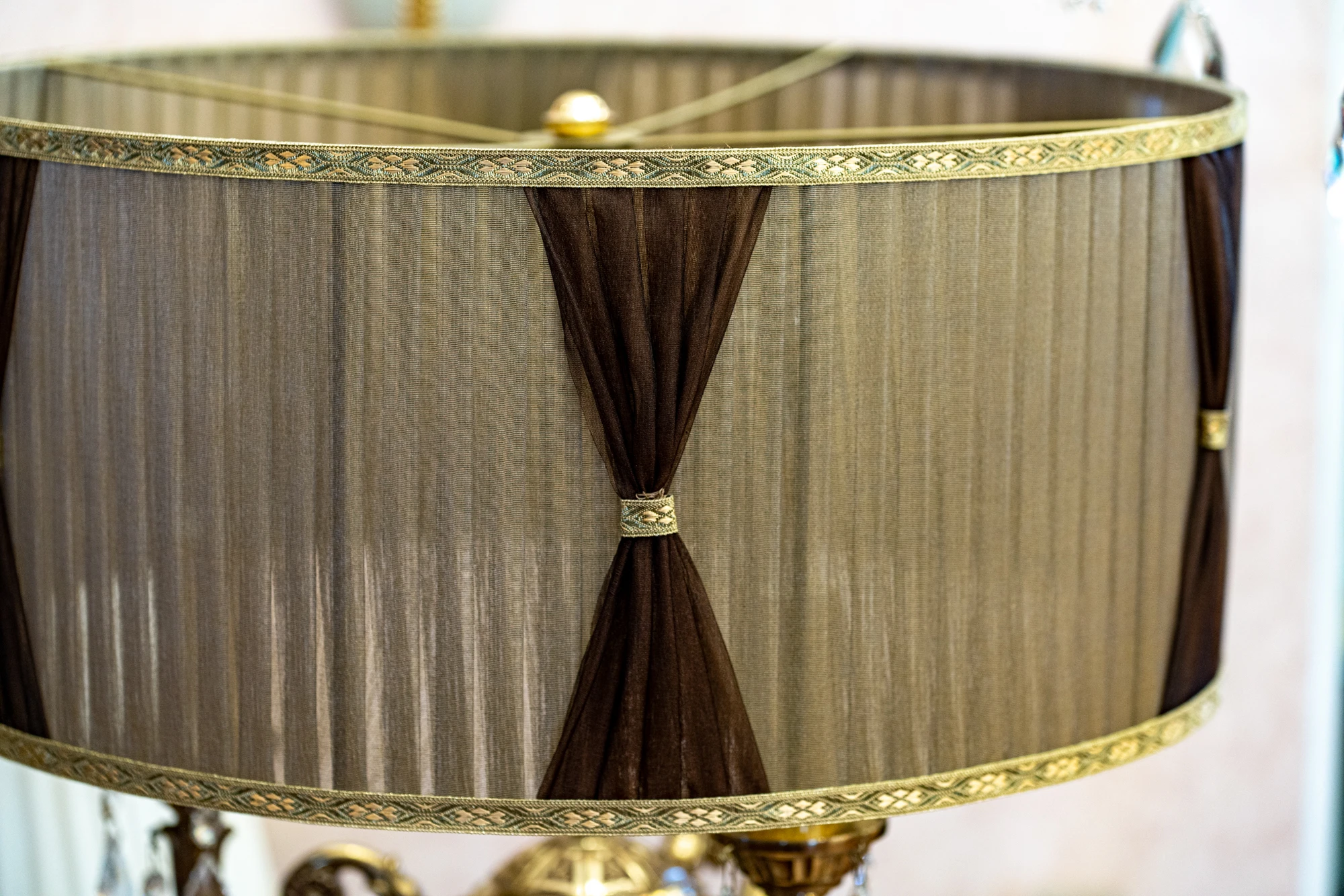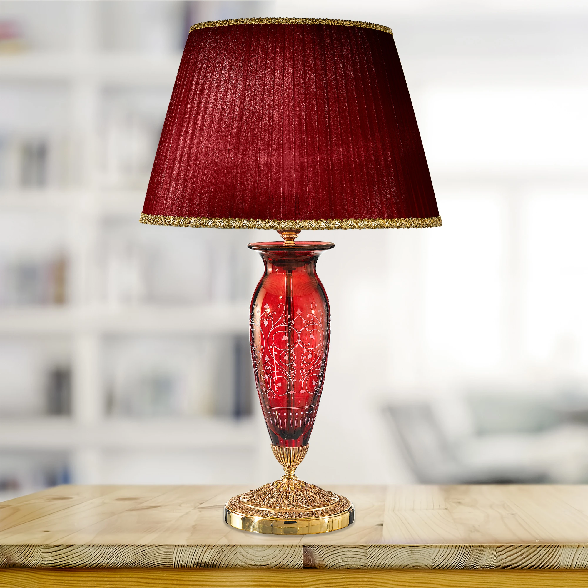 French gold finish, red decorated crystal, and pleated organza lampshade.They can be seen in the home of Manfredi, head of the Anacleti clan.