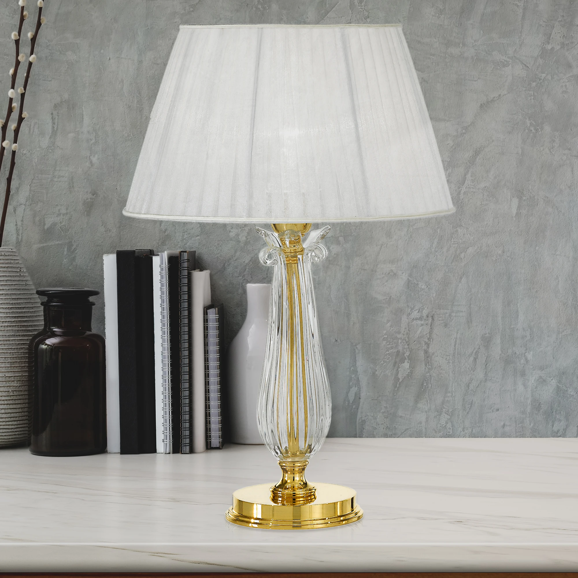 269/P Floor Lamp – Valentina Collection Simple lines in brass and clear crystal, 24k gold finish, and pleated organza shades. Featured in the home of Hon. Filippo Malgradi.