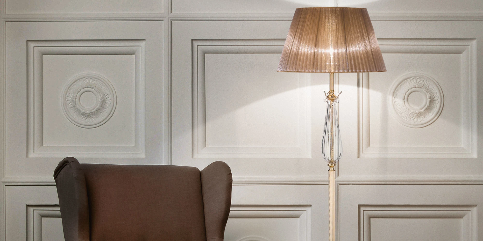 888/P3-SH/P Floor Lamps – Windsor Collection Classic and versatile, ideal for both refined interiors and large spaces such as staircases or halls. In Suburra, they appear with French gold finish, Schöler plates, and organza shades.