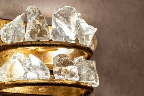 The glass, skillfully fractured, has the dual function of a decorative element and a light diffuser. It rests on simple hammered brass tubes, which form circles, and as soon as these "splits" are illuminated, games of light are created that run endlessly. This simple shape is extremely customizable in size and finishes. Its versatility makes it suitable for any type of furniture. Here it is presented in Shaded Satin Gold Plated, but obviously the finish can be customized.