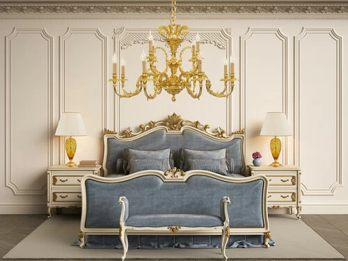 This brass wall light and chandelier collection is very rich in details and the precious gold plated finish makes it particulary refined and elegant, The addition of pear shape Schoeler crystals makes it even more luxurious.