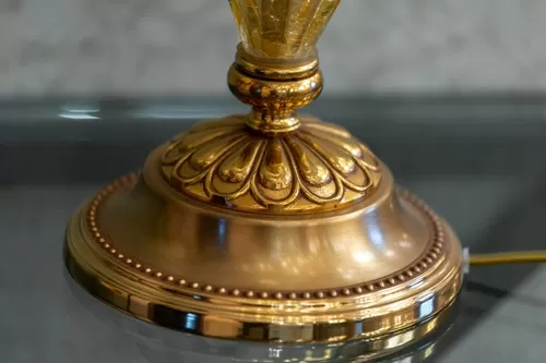 Possoni Illuminazione Table lamp french gold finish antique brass finish with amber crackle glass and shade øsu= 25cm | øin= 15cm | H= 40cm