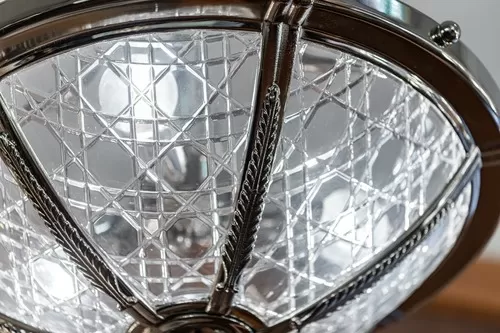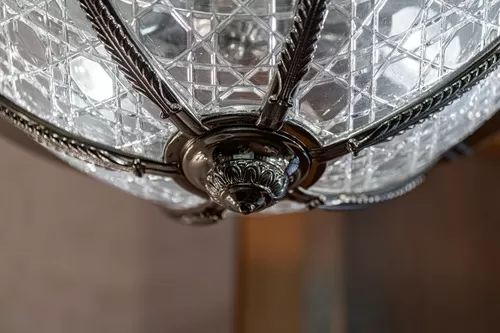 The main element of this collection is the transparent decorated crystal framed by subtle brass elements embellished with leaf-shaped decorations. The finishes in pure gold and polished nickel make the collection suitable for both classic and contemporary settings. Customizable in finishes.