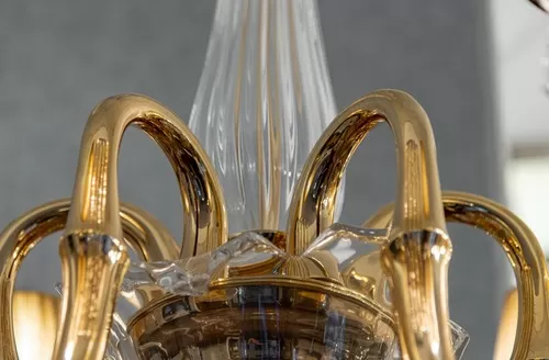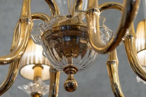 The simplicity of the brass lines and the transparency of the crystal make this collection very elegant and refined, in pure gold finish with pleated organza lampshades. It lends itself to customizations in finishes and dimensions.