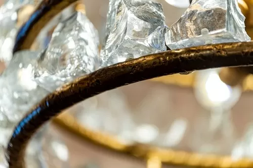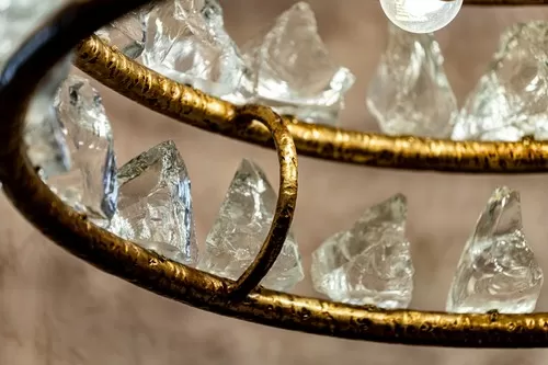 Applique personalizzabile nelle dimensioni e finiture, il vetro fratturato è appoggiato su semplici tubi in ottone martellinato, che formano dei cerchi.