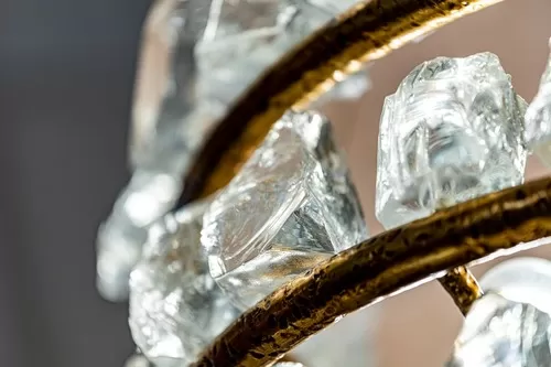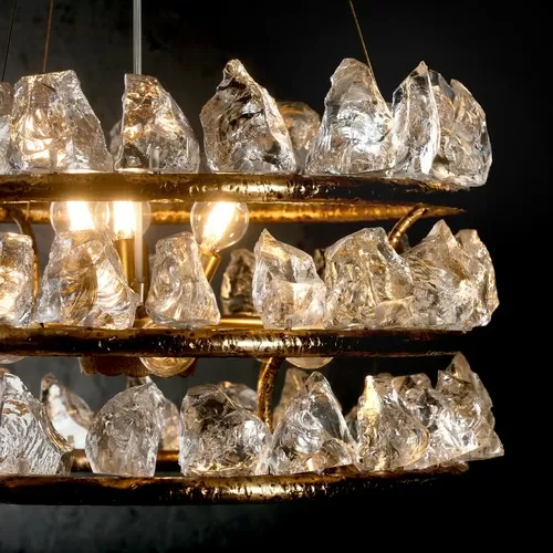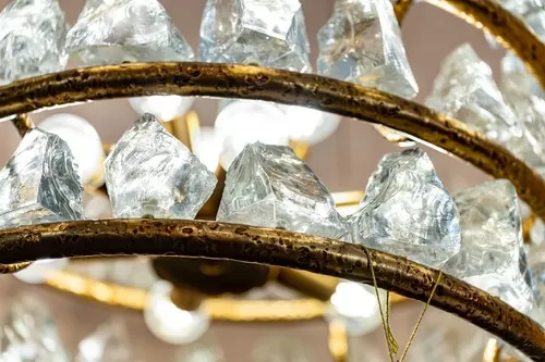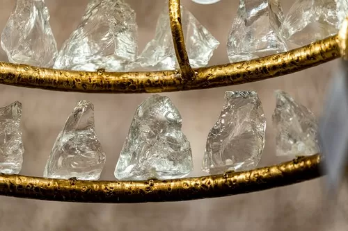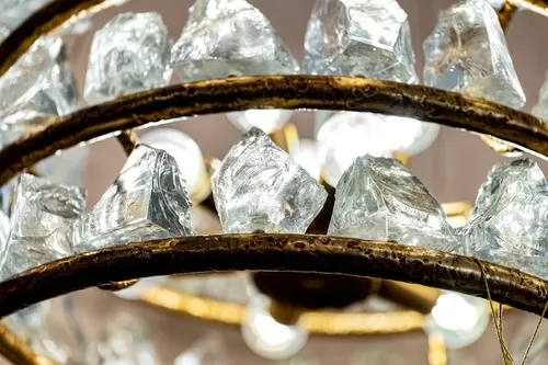 2020-09-30 12:44:07 Applique personalizzabile nelle dimensioni e finiture, il vetro fratturato è appoggiato su semplici tubi in ottone martellinato, che formano dei cerchi.