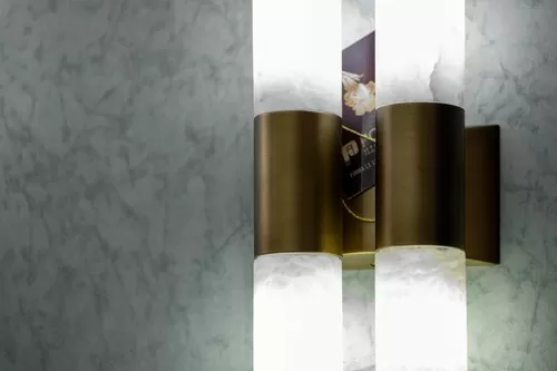 Il semplice tubo in alabastro, dove l'ottone ha funzione di sostegno, è semplicemente spettacolare una volta che la luce mette in evidenza le venature naturali dell'alabastro. Ogni pezzo è diverso dall'altro, un'unicità che solo la natura può regalare e che lo rende un "senza tempo" adatto ad ogni tipo di ambientazione dalla più classica fino al design. La collezione è composta da sospensioni ed applique .