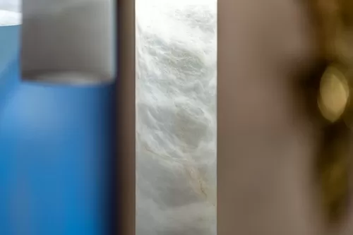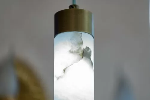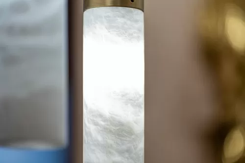 Il semplice tubo in alabastro, dove l'ottone ha funzione di sostegno, è semplicemente spettacolare una volta che la luce mette in evidenza le venature naturali dell'alabastro. Ogni pezzo è diverso dall'altro, un'unicità che solo la natura può regalare e che lo rende un "senza tempo" adatto ad ogni tipo di ambientazione dalla più classica fino al design. La collezione è composta da sospensioni ed applique .
