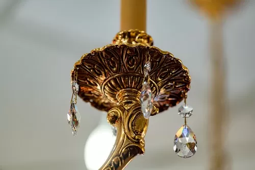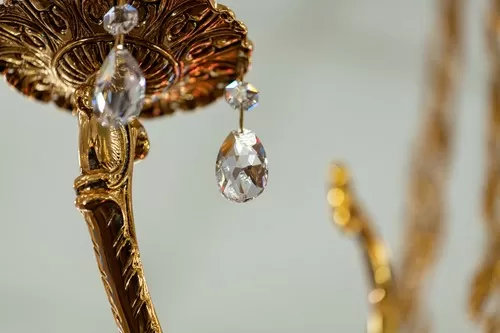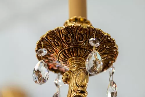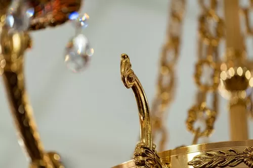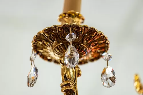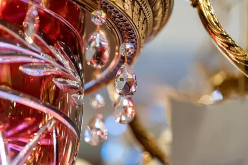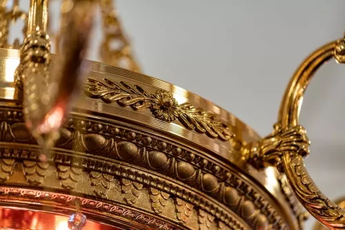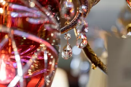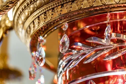 Lampadario oro zecchino sfumato con cristallo rosso e gocce Schoeler