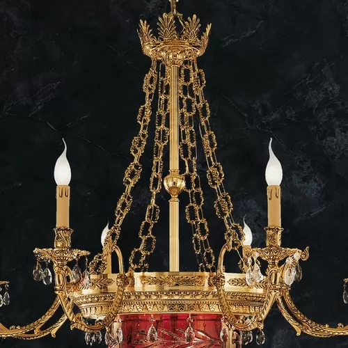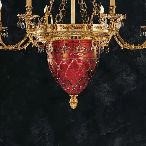 Lampadario oro zecchino sfumato con cristallo rosso e gocce Schoeler
