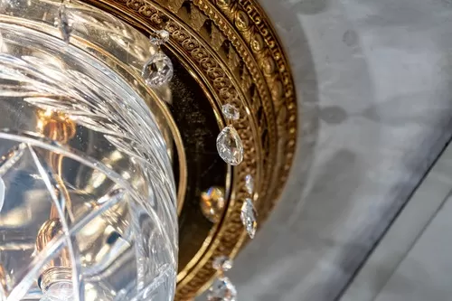 Sospensioni e plafoniere in oro zecchino sfumato danno vita alla collezione Edgard. Ottone lavorato abbinato ad importanti coppe in cristallo disponibili nei colori ambra, rosso o trasparente sono arricchite da piccole gocce in cristallo Schoeler. A tutti i modelli è abbinabile l'applique in ottone e cristallo.