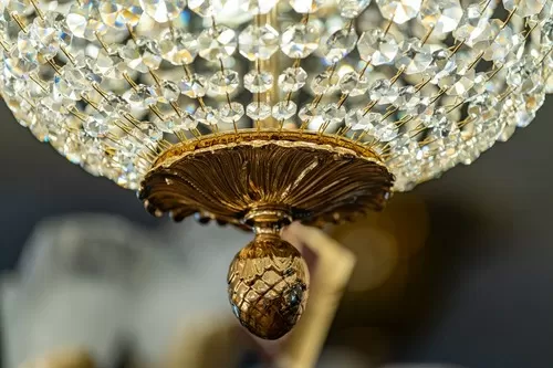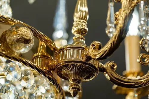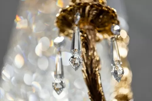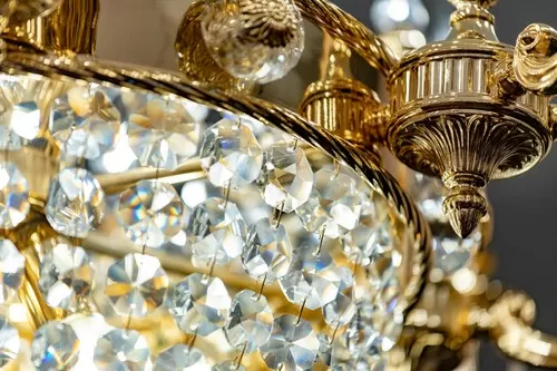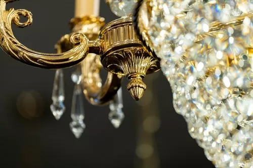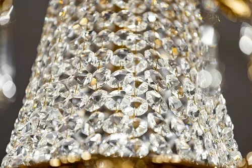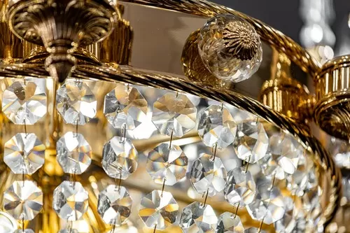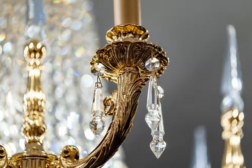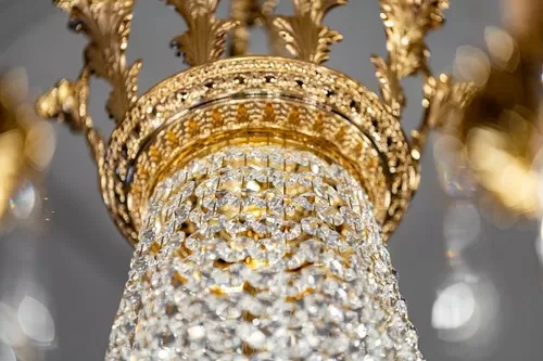 Un grande classico delle stile Impero realizzato in ottone in finitura Oro Zecchino, con cristalli Schoeler e dettagli in cristallo nella fascia metallica, è possibile realizzare questo lampadario anche in dimensioni importanti.