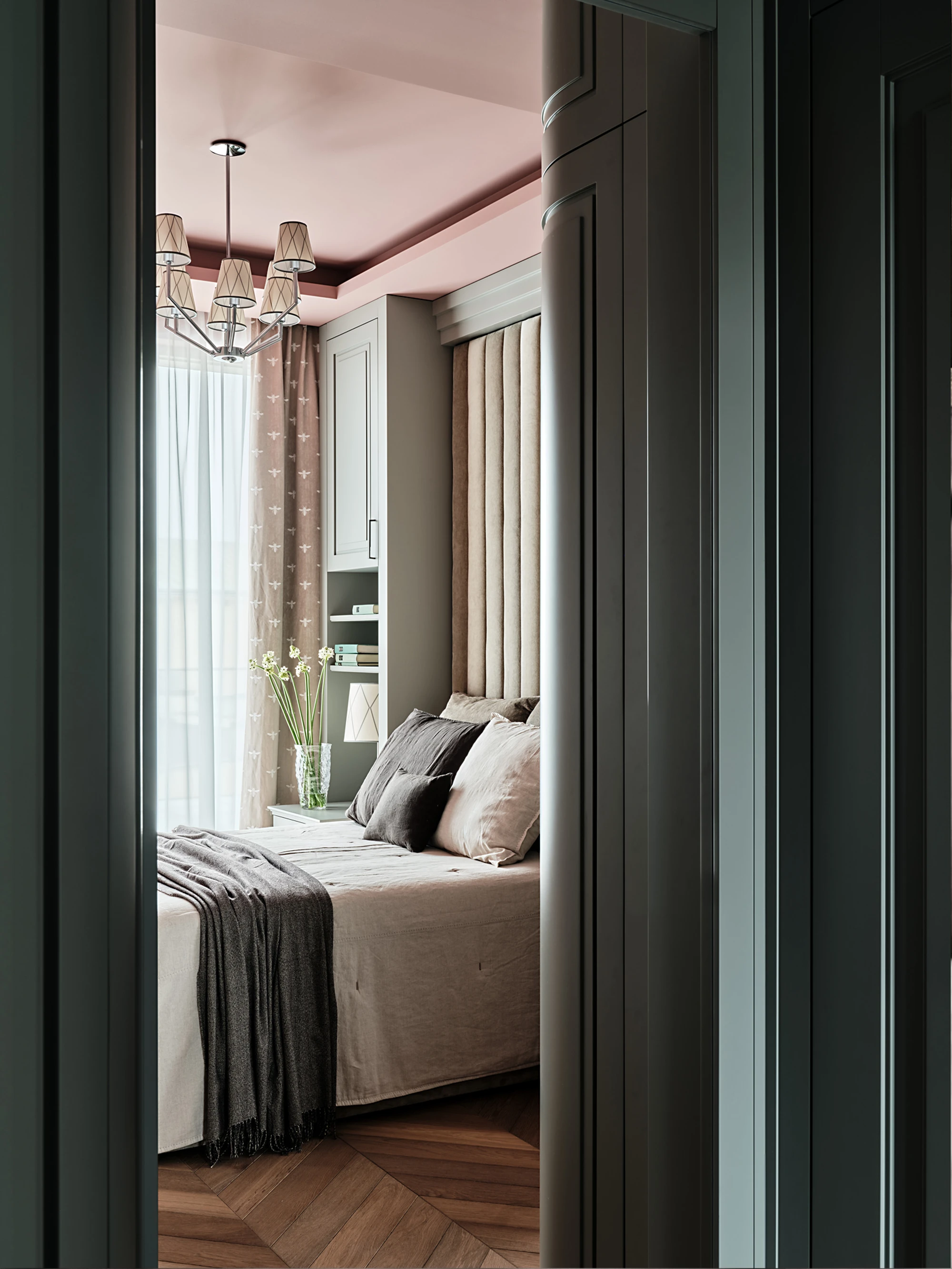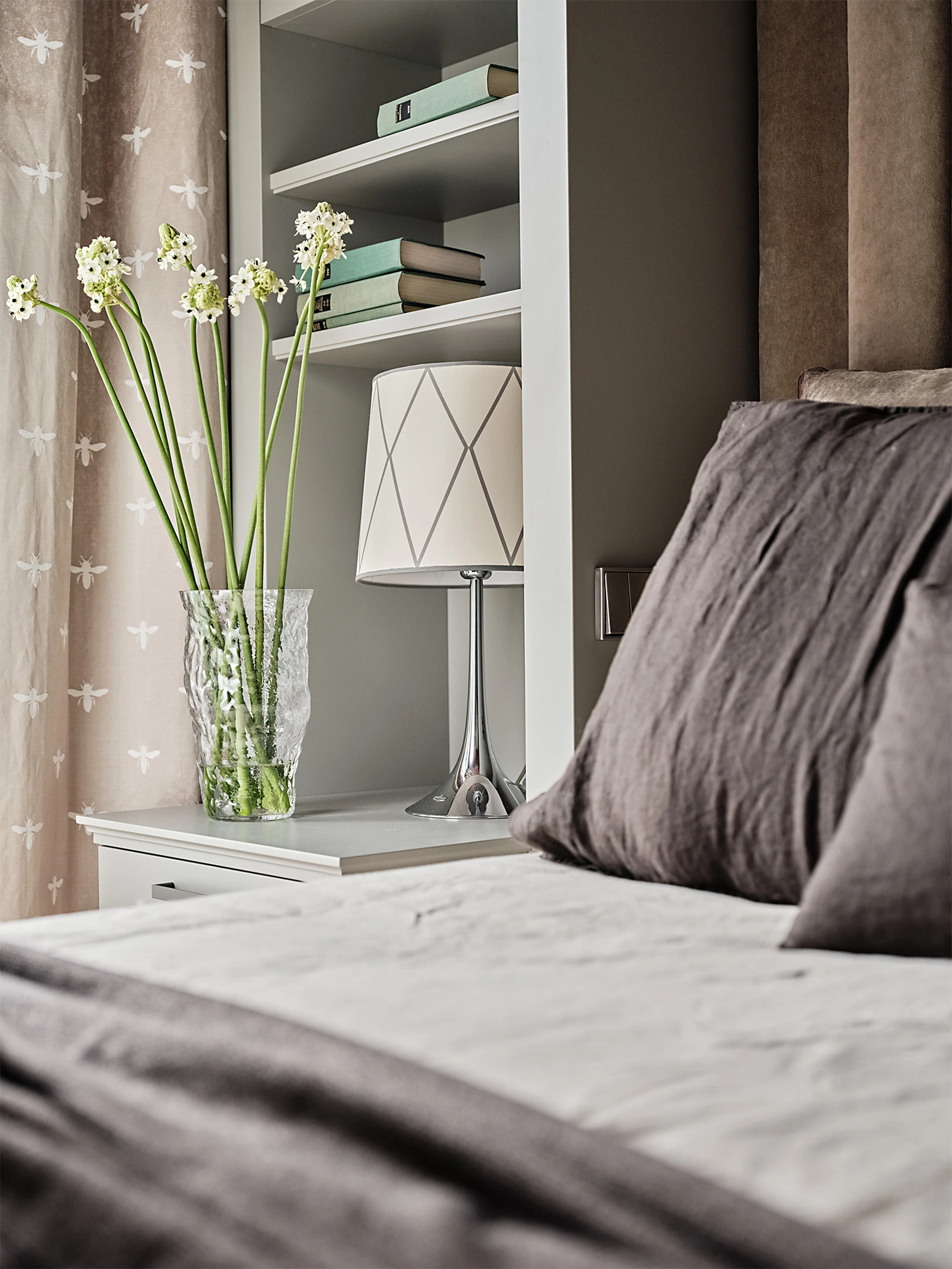 Для спальни архитектор выбрал нашу лампу Epoque, доступную как в виде люстры, так и настольной лампы с хромированной отделкой. Сдержанная элегантность и изысканные линии коллекции Epoque гармонично вписываются в интерьер квартиры, добавляя нотку утончённого и функционального освещения.