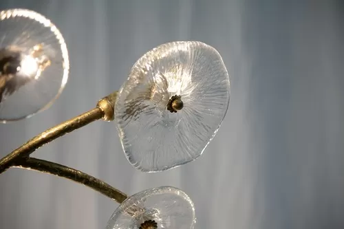 Цветущий луг вдохновил дизайнера на создание этой впечатляющей коллекции, где кованое стекло, как настоящий цветок, украшает структуру из латуни. Здесь модель представлена в потолочных и настенных версиях, но она также подходит для адаптации к самым различным потребностям освещения. Отделка выполнена из натуральной латуни, но может быть изменена по желанию клиента.