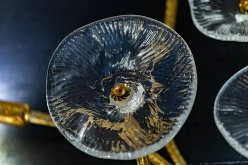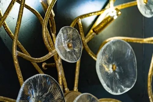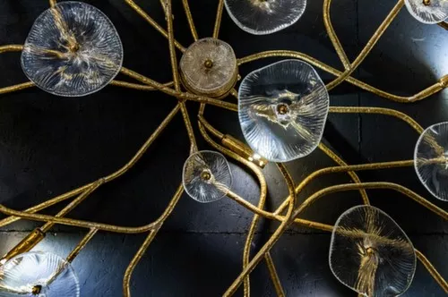 Цветущий луг вдохновил дизайнера на создание этой впечатляющей коллекции, где кованое стекло, как настоящий цветок, украшает структуру из латуни. Здесь модель представлена в потолочных и настенных версиях, но она также подходит для адаптации к самым различным потребностям освещения. Отделка выполнена из натуральной латуни, но может быть изменена по желанию клиента.