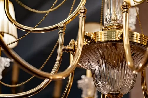 Эта изысканная и элегантная коллекция люстр, бра, настольных ламп и торшеров идеально сочетает в себе тонкую латунь и хрусталь с изящными формами. Абажуры, которые дополняют его, могут быть в кремовой органзе или в шаньтунге. Отделка и размеры по запросу клиента.